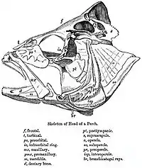 In humans and other mammals, the endocranium forms during fetal development as a cartilaginous neurocranium, that ossifies from several centers.[3] Several of these bones merge, and in the adult primates (including humans), the endocranium is composed of only five bony elements (from front to back):[4]
