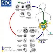 There are two stages in the life cycle of E. polecki.[2] The first is as a trophozoite, a vegetative stage that cannot survive in the environment.[2] The second is a cyst, where transmission of parasite is possible and provides protection to harsh external environments. Cysts are infective when ingested by another organism.[2] The cystic form of this protozoan has a diameter as small as 9.5 µm and as large as 17.5 µm. Morphologically, E. polecki is extremely similar to Entamoeba histolytica and Entamoeba hartmanni. [2]