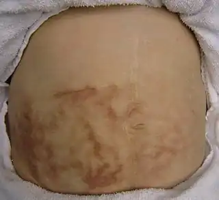 Erythema ab igne (EAI), also known as hot water bottle rash, is a persistent patterned discolouration of skin caused by long-term exposure to heat.[1][2] It generally starts as mottling and lace-like redness before changing to various shades of pink and purplish-brown.[2]