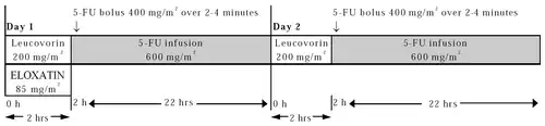 Day 1–2: Oxaliplatin 100 mg/m2 IV infusion, given as a 120 minutes IV infusion in 500 mL D5W, concurrent with leucovorin 400 mg/m2 (or levoleucovorin 200 mg/m2) IV infusion, followed by 5-FU 400 mg/m2 IV bolus, followed by 46-hour 5-FU infusion (2400 mg/m2 for first two cycles, and may be increased to 3000 mg/m2 if tolerated by patient (no toxicity > grade 1 during the first two cycles).