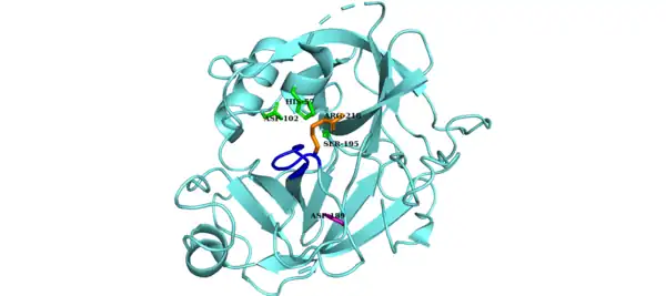 ![]() The non-canonical conformation of Factor D is inhibited by the self-inhibitory loop (blue). The Asp-Arg salt bridge (purple and orange side chains, respectively) stabilizes the self-inhibitory loop. The catalytic triad is shown in green.[13] |