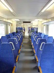 Grab rails on a longer-distance commuter train catering for mainly seated passengers
