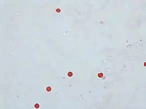 The Kleihauer–Betke test is a blood test used to measure the amount of foetal hemoglobin transferred from a foetus to its mother's bloodstream.[4] It takes advantage of the differential resistance of foetal hemoglobin to acid. A standard blood smear is prepared from the mother's blood, and exposed to an acid bath. This removes adult hemoglobin, but not foetal hemoglobin, from the red blood cells. Subsequent staining, using Shepard's method,[5] makes fetal cells (containing foetal hemoglobin) appear rose-pink in color, while adult red blood cells are only seen as "ghosts". 2000 cells are counted under the microscope and a percentage of foetal to maternal cells is calculated.