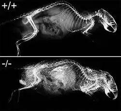 The function of Fetuin-A in the body was determined by gene knockout technology in mice. Knocking out the gene for fetuin-A rendered the mice completely fetuin-A deficient. Feeding a mineral-rich diet to fetuin-A-deficient mice resulted in widespread calcification (ectopic mineralization) of lung, heart, and kidneys in these mice. The calcification became drastically exacerbated when the fetuin-A knockout was combined with the genetic background DBA/2. The mouse strain DBA/2 is known for its proneness to calcify damaged tissues, a process called "dystrophic calcification". Fetuin-A deficiency dramatically increased the calcification proneness of these mice in that all mice spontaneously calcified throughout their body even without a mineral-rich diet or surgical tissue trauma. Fetuin-A is therefore regarded as a potent inhibitor of systemic calcification.