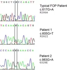 - ↑ Petrie, KA; Lee, WH; Bullock, AN; Pointon, JJ; Smith, R; Russell, RG; Brown, MA; Wordsworth, BP; Triffitt, JT (2009). "Novel mutations in ACVR1 result in atypical features in two fibrodysplasia ossificans progressiva patients". PLOS ONE. 4 (3): e5005. Bibcode:2009PLoSO...4.5005P. doi:10.1371/journal.pone.0005005. PMC 2658887. PMID 19330033.