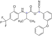 Tau-fluvalinate (τ-fluvalinate) is the trivial name for (2R)-fluvalinate. The C atom in the valinate structure is in (R)-absolute configuration, while the second chiral atom is a mixture of (R)- and (S)-configurations:[4]