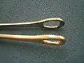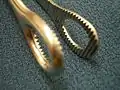 A foerster clamp is a surgical clamp with a round eyelet.[1] Also known as a sponge clamp, or sponge stick. Used for atraumatically grasping lung tissue in thoracic surgery. When grasping a surgical sponge in the jaws, Foerster clamps are commonly used for removing small amounts of fluids from the operative area and applying pressure to sites of bleeding.[1] May also be used for tissue dissection. Invented by David William Foerster of Oklahoma City, Oklahoma, who pioneered sex change operations in the United States.