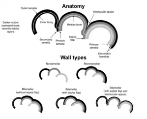 Bilamellar test walls can be further divided into those with septal flaps (a layer of test wall covering the previously-secreted septum) and those lacking septal flaps. Septal flaps are not known to be present in any foraminifera other than those with bilamellar walls.