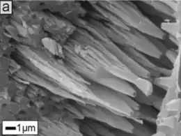One genus, Miliamellus, has a non-perforated test made of opaline silica.[29] It is similar in shape and structure to the porcelanous tests of typical miliolids; the test consists of an internal and external organic layer, as well as a middle silica layer made of elongate rods. This silica layer is further divided into outer, middle, and inner subunits; the outer and inner subunits each are approximately 0.2μm thick and consist of subparallel sheets of silica rods with their long axes parallel to the test surface. The middle subunit is approximately 18μm in thickness and consists of a three-dimensional lattice of silica rods with no organic component in the open space. The ultrastructure differs from that of miliolids in that the rods are over twice as long and twice as thick on average, in that the rods of Miliamellus are hollow rather than solid, and of course in having a silica test rather than calcite.[30]