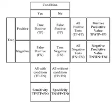 - Positive predictive value (the rate at which the condition is present when the test is positive) TP/(TP + FP)