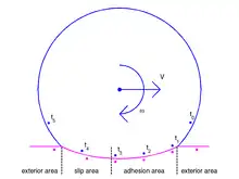 In 1967, Joost Jacques Kalker published his milestone PhD thesis on the linear theory for rolling contact.[6] This theory is exact for the situation of an infinite friction coefficient in which case the slip area vanishes, and is approximative for non-vanishing creepages. It does assume Coulomb's friction law, which more or less requires (scrupulously) clean surfaces. This theory is for massive bodies such as the railway wheel-rail contact. With respect to road-tire interaction, an important contribution concerns the so-called magic tire formula by Hans Pacejka.[7]