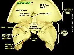 The frontal crest is a ridge on the internal surface of the squamous part of the frontal bone formed by the inferior convergence of the two edges of the sagittal sulcus. The frontal crest gives attachment to the falx cerebri.[1]
