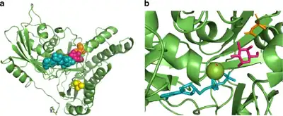 | a) Three-dimensional structure of human GALK1 green, adenosine triphosphate cyan and galactose pink bound in the active site b) close-up of active site show how Asp46 binds, the galactose molecule through C3-OH and C4-OH | |