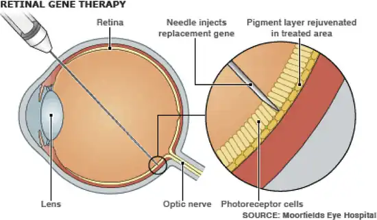 - ↑ Lee, JH; Wang, JH; Chen, J; Li, F; Edwards, TL; Hewitt, AW; Liu, GS (28 August 2018). "Gene therapy for visual loss: Opportunities and concerns". Progress in Retinal and Eye Research. 68: 31–53. doi:10.1016/j.preteyeres.2018.08.003. PMID 30170104. S2CID 52141333.