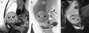 | Bilateral germinal matrix hemorrhages in a 28 gestational week fetus -a)Image demonstrates abnormal hypointensity in the germinal matrix b) image demonstrates T1 hyperintensity lining the lateral ventricles c)image demonstrates marked hypointensity in similar regions | |