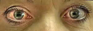 Photo showing conjunctival vessels dilated at the corneal edge (ciliary flush, circumcorneal flush) and hazy cornea characteristic of acute angle closure glaucoma
