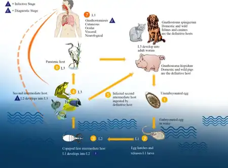 G. spinigerum has a multi-host life history. The eggs hatch in fresh water and the larvae are eaten by water fleas of the genus Cyclops. The water fleas are in turn eaten by small fish. Eventually, the larvae end up in the stomachs of carnivores, usually cats and dogs. The larva bores through the stomach wall and migrates around in the host's body for about three months before returning to the stomach and attaching itself in the gastric mucosa. It then takes another six months to mature. The eggs are carried in the host's feces, and if they reach fresh water the cycle begins again. As humans are not a normal host for the larvae, they do not mature in humans, but can cause various degrees of damage, depending on where the larvae wander in the body.