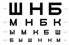 The table consists of two parts with 12 rows each, representing visual acuity values between 0.1 and 2.0.[3] The left part consists of series of the Cyrillic letters Ш, Б, М, Н, К, Ы, and И in a definite order, and the right part of the table consists of a series of Landolt C symbols. The width of each character is equal to its height, and the contours have standard 1⁄5 gaps of the overall size.