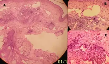 | a) Patchy mononuclear cell infiltration in upper dermis b) patchy mononuclear cell infiltration with dilatation of capillaries c) mononuclear cell infiltration around sweat duct | |
