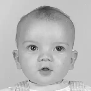 | Patient with Greig cephalopolysyndactyly syndrome showing hypertelorism and macrocephaly. | |