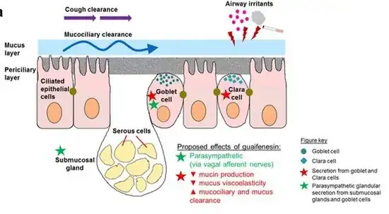 Guaifenesin is thought to act as an expectorant by increasing the volume and reducing the viscosity of secretions in the trachea and bronchi. It has been said to aid in the flow of respiratory tract secretions, allowing ciliary movement to carry the loosened secretions upward toward the pharynx.[16] Thus, it may increase the efficiency of the cough reflex and facilitate removal of the secretions.