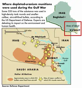 The Gulf War included the first widespread combat usage of depleted uranium (DU), in tank kinetic energy penetrator and autocannon rounds.[31] DU has been suggested as a possible cause of Gulf War syndrome.[32]