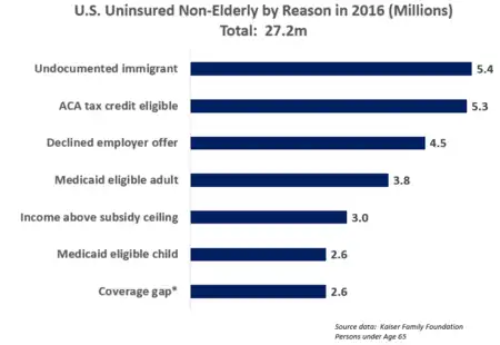 The Kaiser Family Foundation reported in October 2016 that there were 27.2 million uninsured under age 65, roughly 10% of the 272 million persons in that group. Kaiser reported that:
