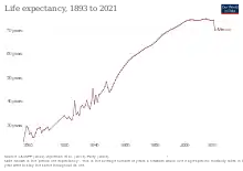 Demographic transition have been notorious in the last 7 decades in Mexico. Life expectancy at birth (general) changed from being 45 years in 1950 to 71.5 years in 1990, and to actually reach 77.5 years, close to some high-income countries in America and the World.[48][51] Child mortality rate, as one of the major health trends, have improved most notoriously after 1950, when an average of 252 children under-five years were dead per 1000 live births, decreasing to 44.5 in 1990 and reaching 14.6, in 2018.[48][51] Finally, after 1970, at least 20 years after the major changes in life expectancy and child mortality rate, there was a decrease in fertility rate. In 1950 it was estimated that for every woman, around 6.67 babies were born; in 1970, it increased to 6.8 and then, steadily decreased to 3.4 in 1990 to finally end in 2.1, which is below the world average.[48][51]