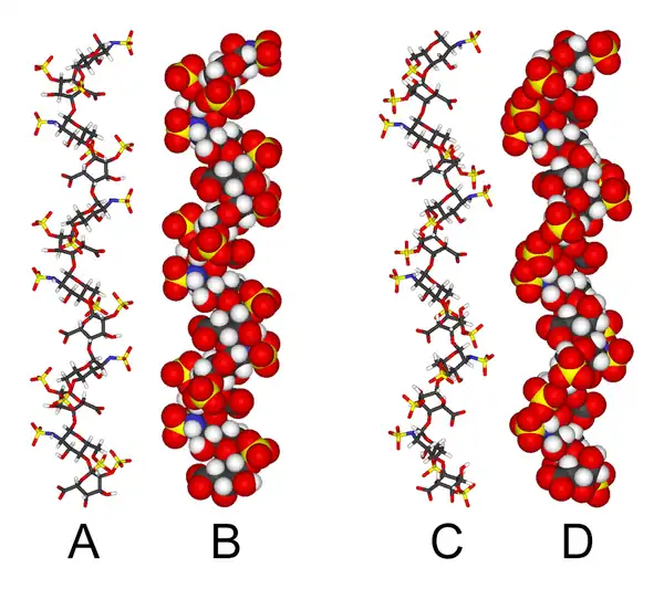 The three-dimensional structure of heparin is complicated because iduronic acid may be present in either of two low-energy conformations when internally positioned within an oligosaccharide. The conformational equilibrium is influenced by sulfation state of adjacent glucosamine sugars.[50] Nevertheless, the solution structure of a heparin dodecasaccharide composed solely of six GlcNS(6S)-IdoA(2S) repeat units has been determined using a combination of NMR spectroscopy and molecular modeling techniques.[51] Two models were constructed, one in which all IdoA(2S) were in the 2S0 conformation (A and B below), and one in which they are in the 1C4 conformation (C and D below). However, no evidence suggests that changes between these conformations occur in a concerted fashion. These models correspond to the protein data bank code 1HPN.[52]