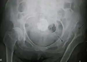 | Congenital dislocation of the left hip in an elderly person. Closed arrow marks the acetabulum, open arrow the femoral head. | |