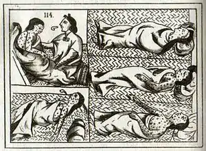 Mexico's native population was one of the first to experience a smallpox epidemic, where many succumbed to the disease. In 1520, the first wave of smallpox killed 5-8 million people. From 1545 to 1576, up to 17 million people died from smallpox. This large amount of deaths in the second wave are thought to be the result of hemorrhagic fevers.[5] An article recounts in Spanish texts, "The pestilence of measles and smallpox was so severe and cruel that more than one-fourth of the Indian people in all the land died--and this loss had the effect of hastening the end of the fighting because there died a great quantity of men and warriors and many lords and captains and valiant men against whom we would have had to fight and deal with as enemies, and miraculously Our Lord killed them and removed them from before us."[6] Although the native people of Mexico had no previous contact with smallpox, these Spanish texts showed that the Spanish population was familiar with the disease and the mortality that resulted from it.