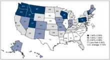 In 2012, Oregon performed a study of all births in the state during the year as a part of discussing a bill regarding licensing requirements for midwives in the state. They found that the rate of intrapartum infant mortality was 0.6 deaths per thousand births for planned hospital births, and 4.8 deaths per thousand for planned home births. They further found that the death rate for planned home births attended by direct-entry midwives was 5.6 per thousand. The study noted that the statistics for Oregon were different for other areas, such as British Columbia, which had different licensing requirements.[46] Oregon was noted by the Centers for Disease Control and Prevention as having the second-highest rate of home births in the nation in 2009, at 1.96% compared to the national average of 0.72%.[47] A 2014 survey of nearly 17,000 voluntarily reported home births in the United States between 2004 and 2010 found an intrapartum infant mortality rate of 1.30 per thousand; early neonatal and late neonatal mortality rates were a further 0.41 and 0.35 per thousand. The survey excluded congenital anomaly-related deaths, as well as births where the mother was transferred to a hospital prior to beginning labor.[42]
