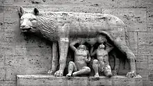 The suckling of infants by animals was a repeated theme in classical mythology. Most famously, twin brothers Romulus and Remus (the former founded Rome) were portrayed as having been raised by a she-wolf which suckled the infants, as depicted in the iconic image of the Capitoline Wolf. The Greek god Zeus was said to have been brought up by Amalthea, portrayed variously as a goat who suckled the god or as a nymph who brought him up on the milk of her goat. Similarly, Telephus, the son of the demigod Heracles, was suckled by a deer.[4] Several famous ancient historical figures were claimed to have been suckled by animals; Cyrus I of Persia was said to have been suckled by a dog, while mares supposedly suckled Croesus, Xerxes and Lysimachus. In reality, though, such stories probably owed more to myth-making about such prominent figures, as they were used as evidence of their future greatness.[5]