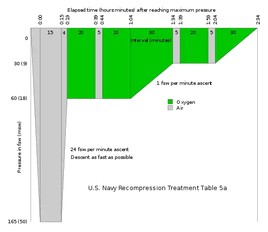 The initial portion of the treatment involves descent on air to the depth of relief plus 30 fsw or a maximum of 165 fsw for ten minutes. Ascent from initial treatment depth to 30 fsw occurs over 10 minutes. The diver then completes the treatment breathing oxygen and is followed by oxygen breathing on the surface for 30 minutes post treatment.