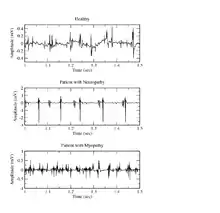 A healthy, neuropathic, and myopathic electromyogram, respectively.