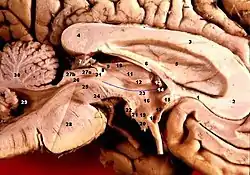 Sagittal section of human brain. Hypothalamic sulcus is 23 (blue line)