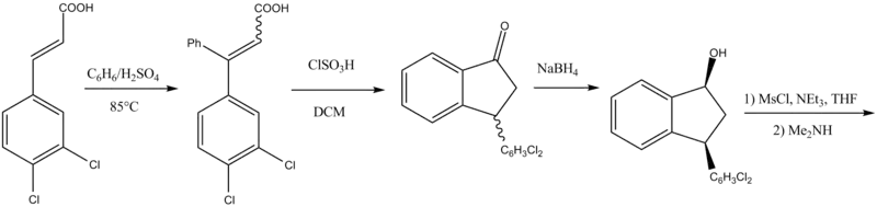 Routes based on 1-indanone-type intermediates are not as simple as a direct reduction of an imine or oxime. The undesirable cis diastereomers are formed instead of the desirable trans isomers. This adds an extra step to the synthetic route. First, the ketones are reduced to mostly cis alcohols. Second, the cis alcohols are converted to the corresponding mesylates, conserving stereochemistry. Third, the mesylates can then be reacted, e.g. with, N-methylbenzylamine, causing a Walden inversion (SN2). Finally, the removal of the benzyl affords the product as a racemic mixture.