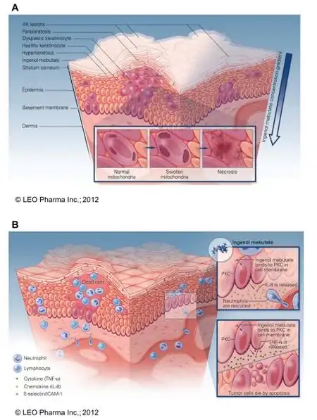 The mechanism by which ingenol mebutate causes cell death is still not fully understood. One study on squamous cell carcinoma, the precursor of which is actinic keratosis, cultures found that the PKC/MEK/ERK signaling pathway is involved in causing cell death after treatment with ingenol mebutate. In addition, the interleukin decoy receptors IL1R2 and IL13RA2 were induced, resulting in a reduction in the long-term viability of the cells, which could help prevent recurrence.[17]