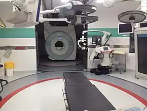 The non-magnetic environment required by the scanner and the strong magnetic radiofrequency and quasi-static fields generated by the scanner hardware require the use of specialized instruments. For example, use of non-magnetic (e.g. Titanium) surgical instruments and MR compatible patient surveillance accessories in addition to the MRI scanner itself increase the cost of IMRI. Often required is the use of an "open bore" magnet, which permits the operating staff better access to patients during the operation. Such open bore magnets are often lower field magnets, typically in the 0.2 tesla range, which decreases their sensitivity and temporal efficiency but also decreases the radio frequency power potentially absorbed by the patient during a protracted operation. Higher field magnet systems are beginning to be deployed in intraoperative imaging suites, which can combine high-field MRI with a surgical suite and even CT in a series of interconnected rooms. Specialty high-field interventional MR devices, such as the IMRIS system, can actually bring a high-field magnet to the patient within the operating theatre, permitting the use of standard surgical tools while the magnet is in an adjoining space. [2]