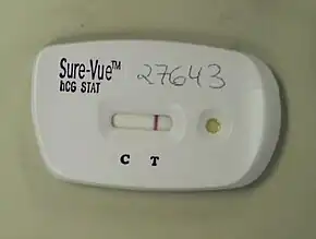 A lateral flow test (LFT),[1] is an assay also known as a lateral flow device (LFD), lateral flow immunochromatographic assay, or rapid test. It is a simple device intended to detect the presence of a target substance in a liquid sample without the need for specialized and costly equipment. LFTs are widely used in medical diagnostics in the home, at the point of care, and in the laboratory. For instance, the home pregnancy test is an LFT that detects a specific hormone. These tests are simple and economical and generally show results in around five to thirty minutes.[2] Many lab-based applications increase the sensitivity of simple LFTs by employing additional dedicated equipment.[3] Because the target substance is often a biological antigen, many lateral flow tests are rapid antigen tests (RAT or ART).