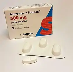 Macrolides (azithromycin) are used in all age groups, while tetracyclines (doxycycline) are prescribed for children above the age of 12 and quinolones (levofloxacin) above the age of 18. Rifampicin can be used in combination with a quinolone or macrolide. Whether rifampicin is an effective antibiotic to take for treatment is uncertain. The Infectious Diseases Society of America does not recommend the use of rifampicin with added regimens. Tetracyclines and erythromycin led to improved outcomes compared to other antibiotics in the original American Legion outbreak. These antibiotics are effective because they have excellent intracellular penetration in Legionella-infected cells. The recommended treatment is 5–10 days of levofloxacin or 3–5 days of azithromycin, but in people who are immunocompromised, have severe disease, or other pre-existing health conditions, longer antibiotic use may be necessary.[1] During outbreaks, prophylactic antibiotics have been used to prevent Legionnaires' disease in high-risk individuals who have possibly been exposed.[1]