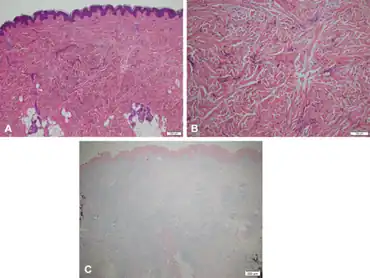 | Cutaneous mucinosis of infancy (Papular mucinosis of infancy)-a,b)Subtle thickening of the reticular dermis with widening of the interstitial space c)highlight the increased mucin. | |