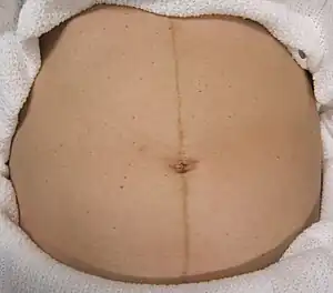 Linea nigra, also known as the pregnancy line, is a line of increased pigmentation seen on the abdomen during pregnancy.[1] It is typically one centimeter (0.4 in) wide, brownish to blackish, and extends vertically in the midline from the pubis to the belly button.[1] Variably, it may extend to the upper abdomen.[1] In first pregnancies, onset is generally in the 3 month; however, it may appear earlier in subsequent pregnancies.[2] It is associated with darkened patches on the cheek and darkened nipples.[6]