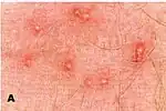 | Lichen planus | Itchy, flat-topped, polygonal, purplish papules with white streaks, which can be solitary, in clusters or in a line.[2][18] | ![]() |