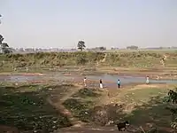 A small river's valley in India shows extensive littering of plastic and paper. Human waste, illustrated by the urinating man, increase fecal coliform and other bacteria levels in the water.