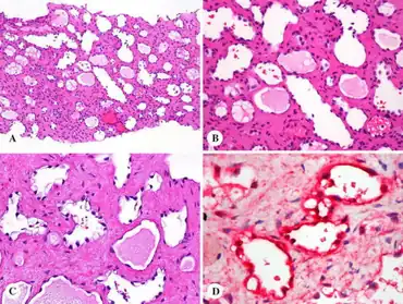 Microscopic examination of biopsy specimens reveals an increase in both the size and number of thin walled lymphatic channels along with lymphatic spaces that are interconnecting and dilated, lined by a single attenuated layer of endothelial cells involving the dermis, subcutis, and possibly underlying fascia and skeletal muscle.[3] Additionally, Tazelaar, et al., described a pattern of histological features of lung specimens from nine patients in whom no extrathoracic lesions were identified, which they termed "diffuse pulmonary lymphangiomatosis" (DPL).[4]