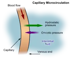 Formation of interstitial fluid from blood. Starling forces are labelled: the hydrostatic pressure is higher proximally, driving fluid out; oncotic forces are higher distally, pulling fluid in.