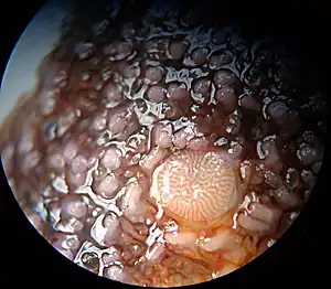 The madreporite /ˌmædrɪˈpɔːraɪt/[1] is a light colored calcareous opening used to filter water into the water vascular system of echinoderms. It acts like a pressure-equalizing valve. It is visible as a small red or yellow button-like structure, looking like a small wart, on the aboral surface of the central disk of a sea star or sea urchin or the oral surface of Ophiuroidea.[2] Close up, it is visibly structured, resembling a "madrepore" (stone coral, Scleractinia) colony. From this, it derives its name.