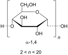 Maltodextrins consist of D-glucose units connected in chains of variable length. The glucose units are primarily linked with α(1→4) glycosidic bonds, like those seen in the linear derivative of glycogen (after the removal of α1,6- branching).[1][4][5] Commercial maltodextrin is typically composed of a mixture of chains that vary from three to 17 glucose units long. Properties of maltodextrin, such as sweetness, viscosity, and texture, can be manipulated during manufacturing by altering the extent of starch hydrolysis.[4]