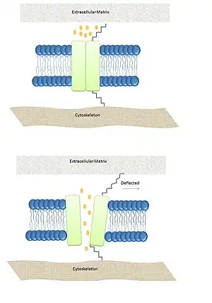 - ↑ Sachs, F; Morris, C. E (1998). "Mechanosensitive ion channels in nonspecialized cells". Reviews of Physiology, Biochemistry and Pharmacology. 132: 1–77. doi:10.1007/BFb0004985. ISBN 978-3-540-63492-8. PMID 9558913.